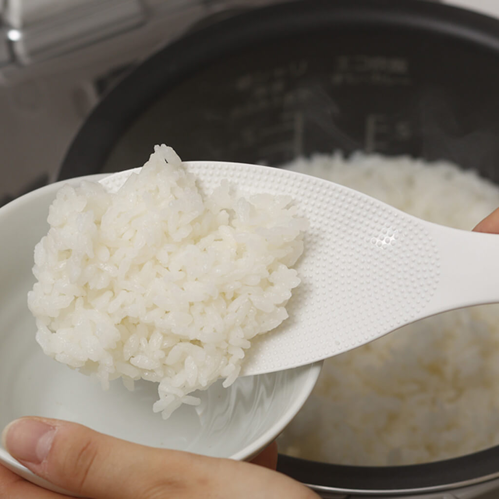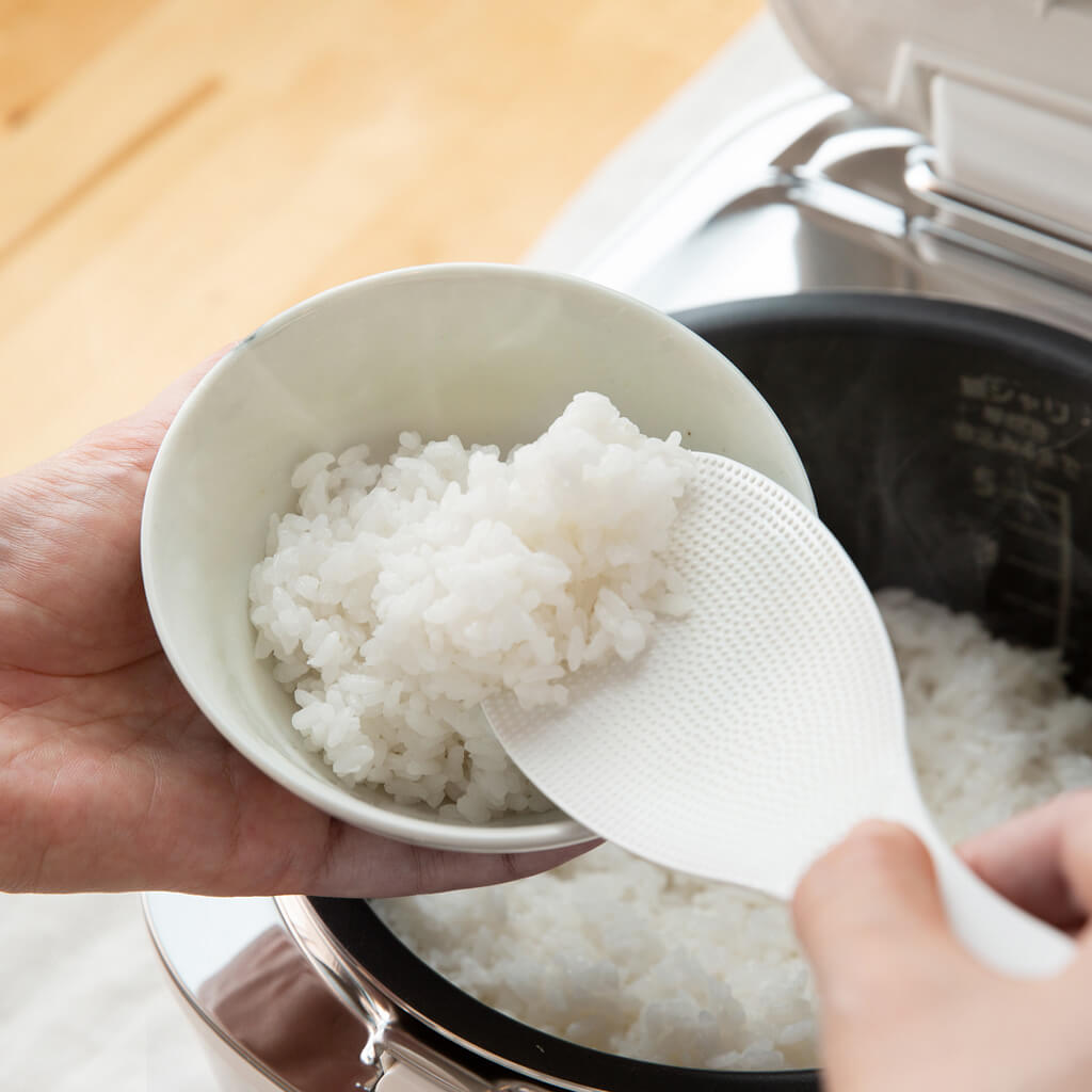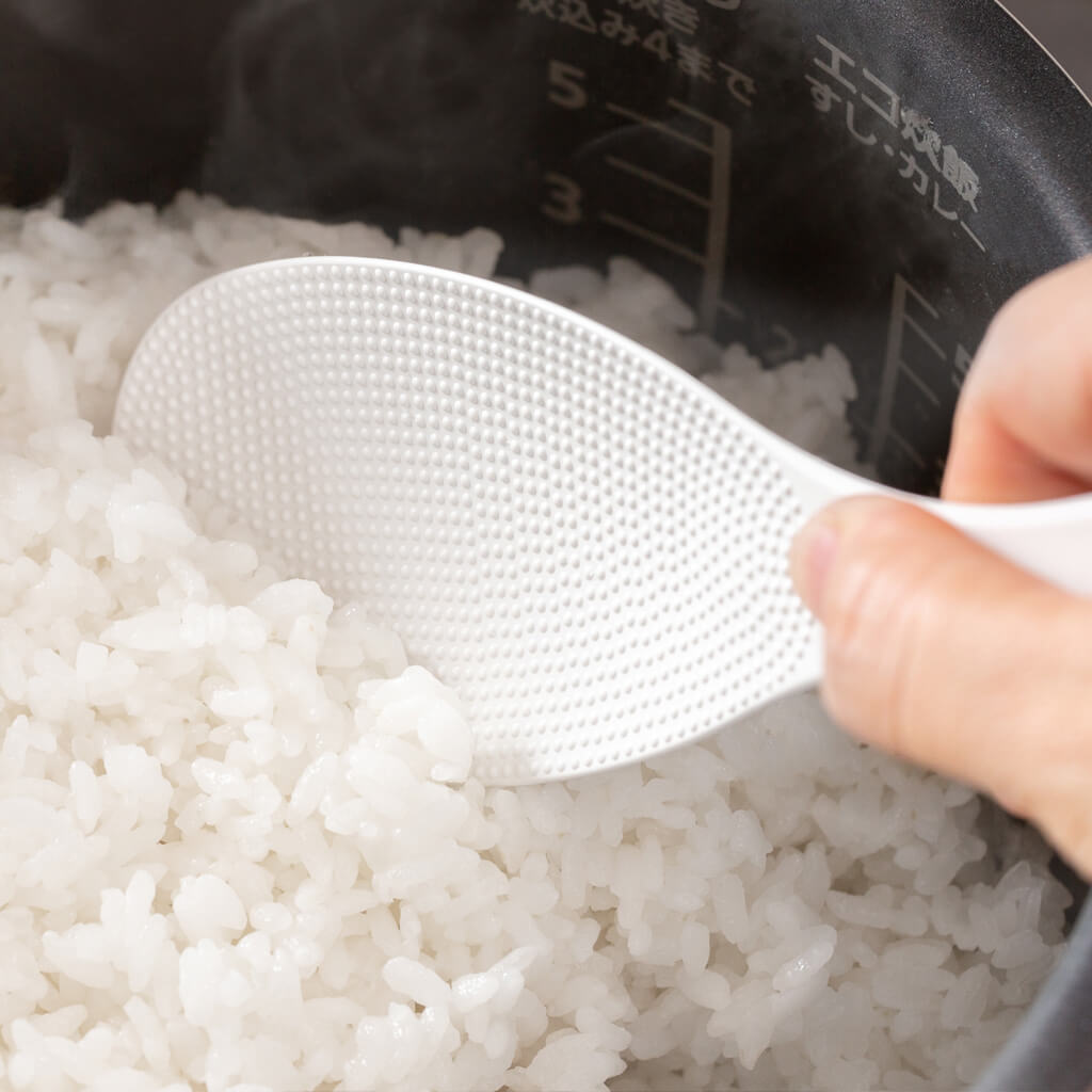お米のプロと開発。おいしさの秘訣「シャリ切り」のしやすさを極めた、理想のしゃもじです。ご飯がつきにくく、混ぜやすいかたちを追求しました。