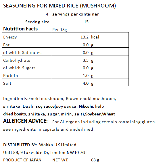 SEASONEING FOR MIXED RICE (MUSHROOM)- 濃いきのこの炊き込みご飯の素 65g