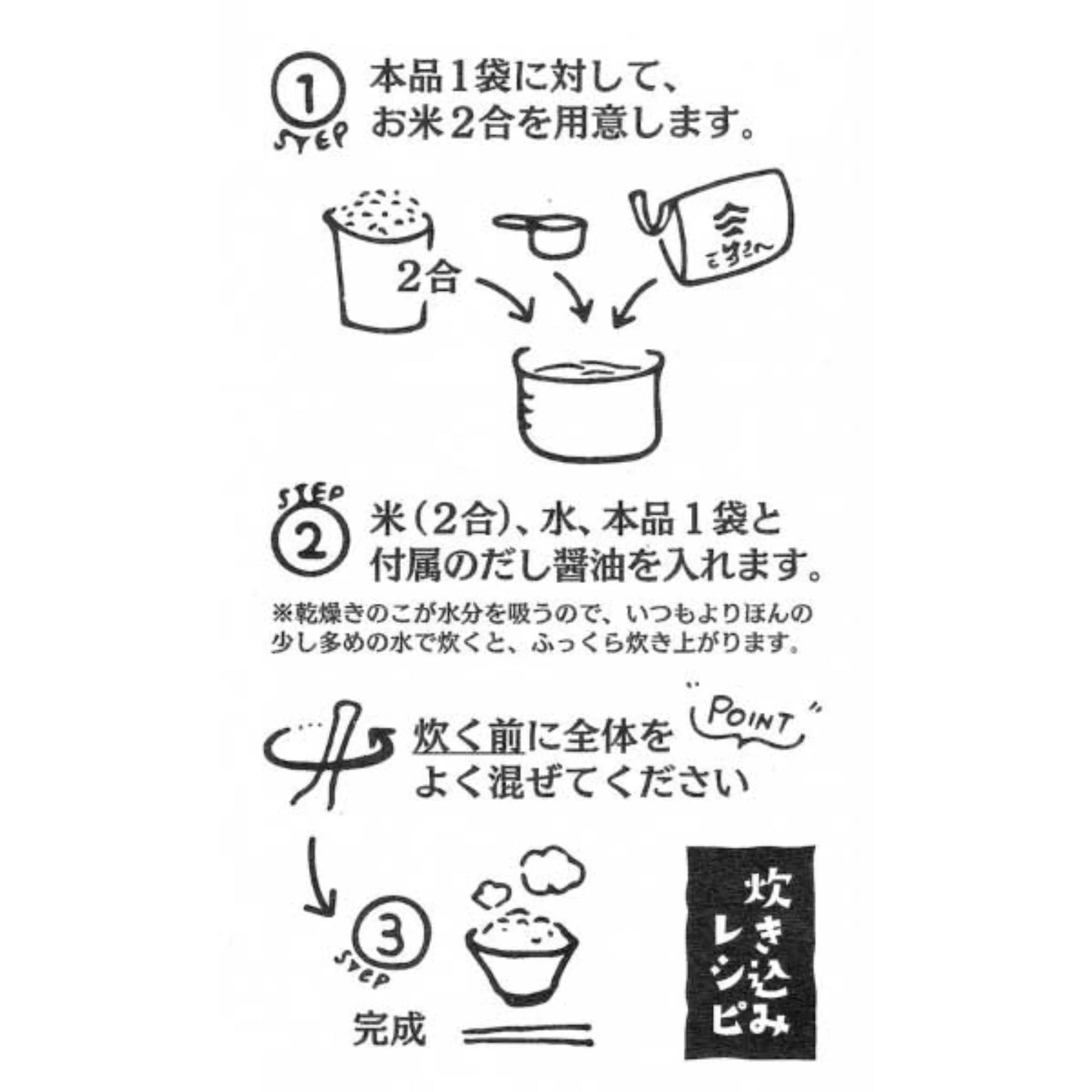 Wild brown enoki mushroom "Dried enoki (black)" cultivated by Mikasa mushroom's original manufacturing method, "Dried enoki (white) that thoroughly adheres to the cultivation method that does not go against the medium and natural circulation, and dried shiitake mushroom are combined with rice and soy sauce to make a delicious and nutritious mushroom-cooked rice.